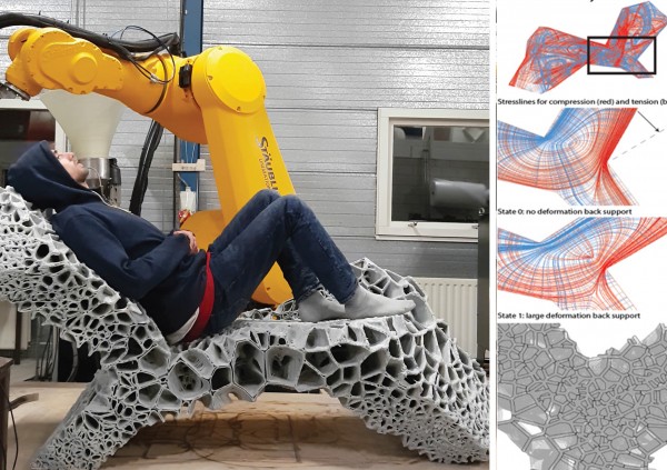 Henriette Bier en Arwin Hidding van de TU Delft hebben de finaleplaats bereikt met een heel ander type innovatie. Zij hebben met een robot een chaise longue geprint die vervormbaar is tot een ligstoel en ook weer teruggebracht kan worden naar de uitgangsvorm. De variabele stijfheid zit in het materiaal dat in Delft werd ontwikkeld: In combinatie met de geprinte structuur kan dit zowel flexibel als stijf zijn. De ontwikkeling aan de TU Delft gebeurt overigens voor toepassingen op andere planeten.