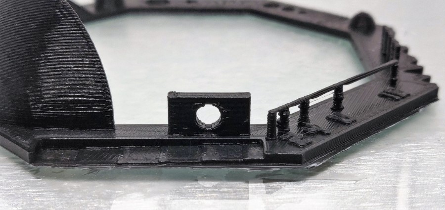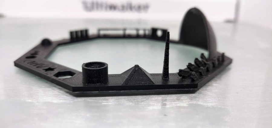 Wat opvalt bij het teststuk, is dat het filament goed wordt teruggetrokken als de printkop even een beweging moet maken zonder dat er materiaal wordt gesmolten. Op enkele detailpunten zie je het oozing effect ontstaan. Vergeleken met andere 3D printers valt het mee. Waarschijnlijk door de instellingen te tweaken kun je dit voorkomen. Het testmodel is echter 3D geprint met de standaard settings van Cura voor Tough PLA. De combinatie van het eigen filament, de instellingen in Cura en de hardware maken het gemakkelijk.