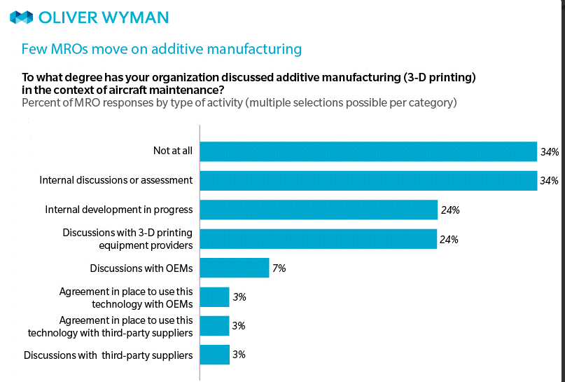 Uit het onderzoek komt verrassend genoeg naar voren dat veel respondenten niet verwachten dat additive manufacturing de komende vijf jaren massaal geïmplementeerd zal worden in het vliegtuigonderhoud. In minder dan één op de vijf bedrijven is de discussie over additive manufacturing het interne bedrijfsniveau overstegen. Zo’n 34% van de deelnemers aan het onderzoek heeft het thema additive manufacturing nog helemaal niet aangesneden. Het aantal bedrijven dat additive manufacturing gaat toepassen is heel gering: 3%. Slechts één op de vier is in gesprek met leveranciers van additive manufacturing machines. De strategen van Oliver Wyman zijn verrast en verbaasd over deze antwoorden. Zij zien juist voor de MRO-bedrijven enorme kansen door additive manufacturing. “Additive manufacturing kan de rol van OEM’ers en PMA producenten (parts manufacturing authority) verkleinen tot design en engineering specialisten. De hoge kosten en de beperkte acceptatie door klanten van luchtvaartmaatschappijen, twee argumenten die nu AM afremmen volgens de MRO-bedrijven, kunnen wel eens sneller wegvallen dan menigeen denkt, aldus de onderzoekers van Oliver Wyman.