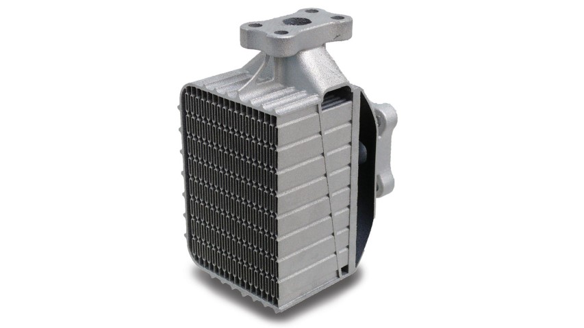 Dit jaar toont Aidro een nieuw product, dat binnenkort leverbaar wordt. Het gaat om een warmtewisselaar. Deze is geprint van aluminium en neemt qua bouwvolume slechts 20% in van het oorspronkelijke onderdeel. Het gewicht bedraagt slechts 15%. De prestaties zijn gelijk aan het vroegere, conventioneel vervaardigde model. Aidro slaagt hierin door de mogelijkheden van 3D metaalprinten maximaal te benutten. Behalve dat de warmtewisselaar in aluminium beschikbaar is, komt er ook een stalen versie. Het Italiaanse bedrijf 3D print de componenten op een EOS M 290 3D metaalprinter.